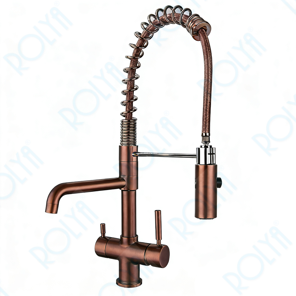 Home » Products » Purified Water Faucets » 3 Way Water Filter Taps » ROLYA Customized Spring Hose 3 Way Kitchen Faucet Antique Copper KF1040-AC
